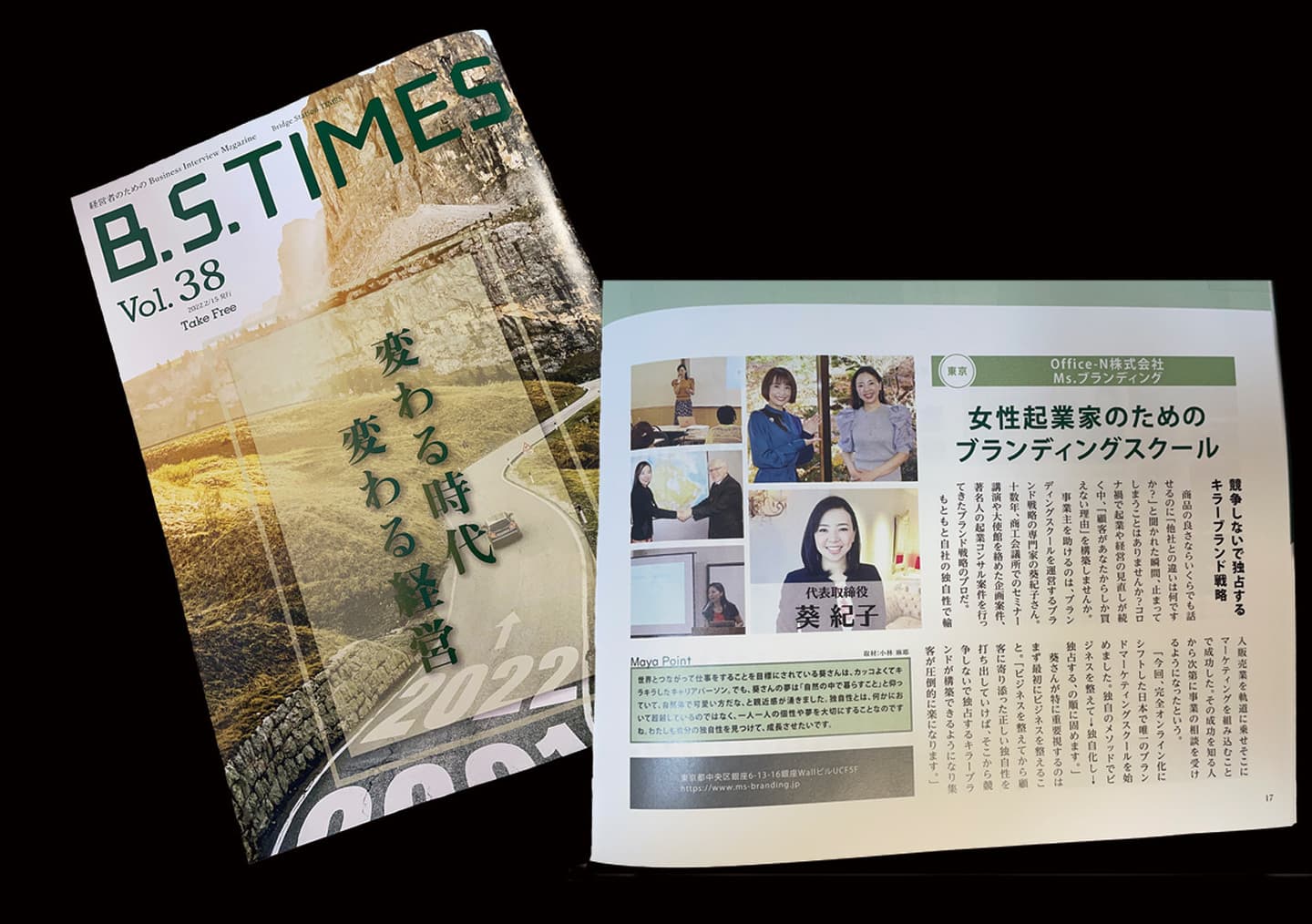 フリーアナウンサー小林麻耶さんから経営者雑誌「B.S.TIMES」掲載のため、葵紀子主宰ビジネススクールの取材を受ける